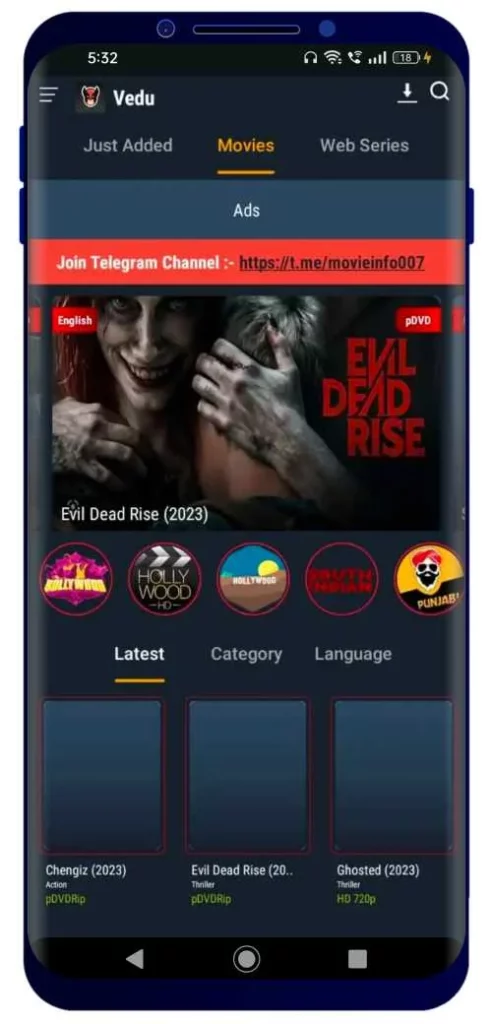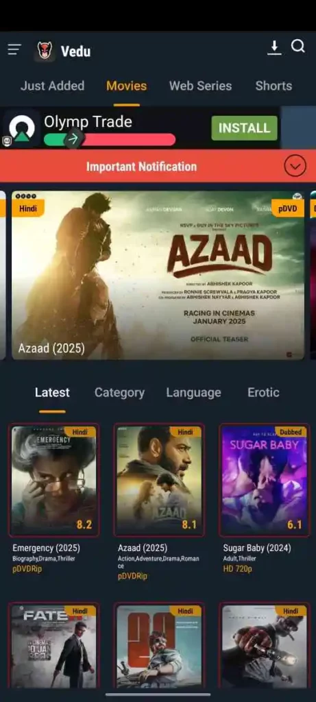Vedu offers a comprehensive content library including Hollywood and Bollywood entertainment for free.